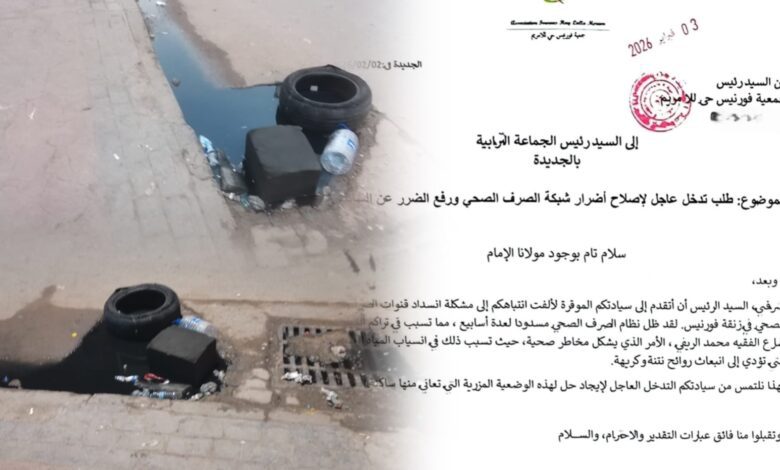 وفي ذات السياق، وجهت جمعية “قورنيس حي لالة مريم” مراسلة رسمية إلى رئيس جماعة الجديدة، بتاريخ 2 فبراير 2026، تطالب فيها بـ“تدخل عاجل لإصلاح أضرار شبكة الصرف الصحي ورفع الضرر عن الساكنة”، وأشارت إلى أن الخلل قائم منذ أسابيع، متسبباً في تراكم المياه العادمة وانبعاث روائح كريهة، مع ما لذلك من انعكاسات محتملة على الصحة العامة وسلامة المارة.
